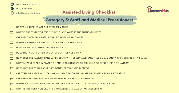 To make sure you’re well prepared, we’ve grouped questions into five categories to use in your checklist for assisted living facilities:
