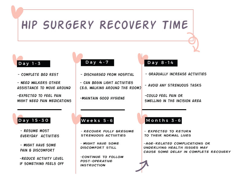 The recovery process after hip surgery will vary depending on the type of surgery. For example, a hip replacement usually requires a longer recovery than a hip repair. One may need six months to a year to fully recover from hip surgery. Here’s the full timetable for hip surgery recovery for the elderly: