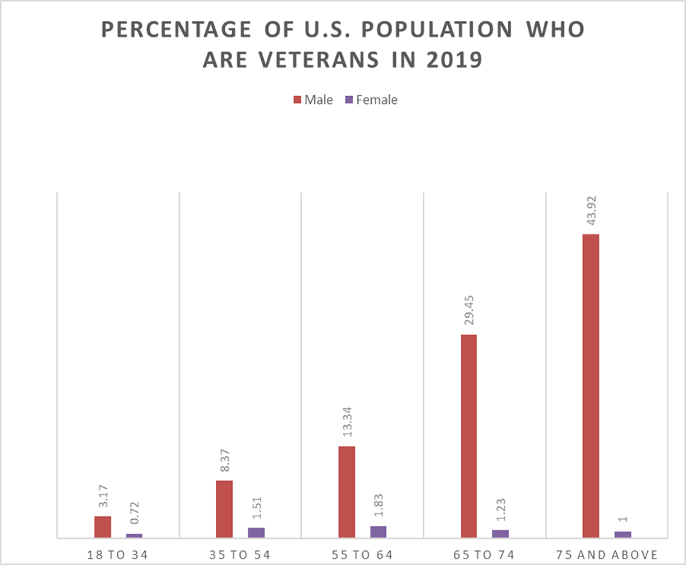 The US veteran population makes up to about 19 million brave men and women who have actively served, or are serving, in the army, navy, air force, coast guard, or marine corps. Each veteran has served for different periods, during the war and in peacetime. According to the Census Bureau, roughly 7% of adults in the United States were veterans in 2018, declining from 18% during 1980. This decline corresponds to a reduction in soldiers deployed. According to the Veteran Administration (VA) forecast, the number of living veterans will decrease over the next 25 years. It is estimated that there will be roughly 12.5 million veterans by 2046, a 35 percent decline from present figures. By that time, Gulf War veterans are expected to make up the majority of those who served, while most Vietnam War veterans will have passed away.